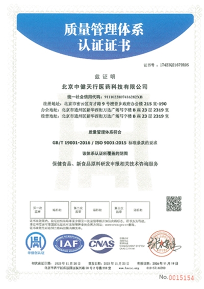 2023年11月20日,北京中健天行醫(yī)藥科技有限公司順利通過(guò)ISO9001質(zhì)量管理體系認(rèn)證,認(rèn)證范圍為保健食品、新食品原料研發(fā)申報(bào)兩大主營(yíng)業(yè)務(wù),成為北京地區(qū)率先獲得該認(rèn)證的研發(fā)申報(bào)服務(wù)商。