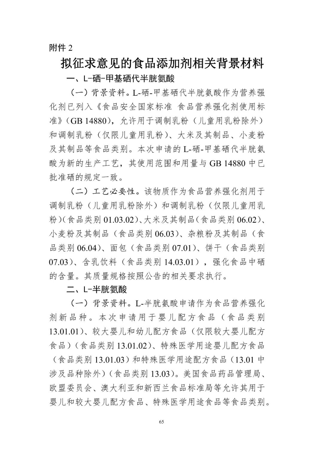 根據(jù)《食品添加劑新品種管理辦法》和《食品添加劑新品種申報(bào)與受理規(guī)定》,L-硒-甲基硒代半胱氨酸等11種食品營(yíng)養(yǎng)強(qiáng)化劑新品種、富馬酸和乙酸鈉2種擴(kuò)大使用范圍的食品添加劑的申請(qǐng),其安全性和工藝必要性已通過(guò)專家評(píng)審委員會(huì)技術(shù)審查(具體情況見(jiàn)附件),現(xiàn)公開(kāi)征求意見(jiàn)。請(qǐng)于2022年9月16日前將相關(guān)意見(jiàn)反饋至我中心郵箱(zqyj@cfsa.net.cn),逾期將視為無(wú)意見(jiàn)。