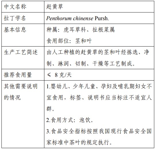 趕黃草是由人工種植的趕黃草地上部分的全株經(jīng)揀選、凈制、淋潤、切制、干燥等工藝制成。趕黃草于2016年申報新食品原料,2020年6月,國家衛(wèi)生健康委員發(fā)布《關(guān)于瑞士乳桿菌R0052等53種“三新食品”的公告(2020年第4號)》,正式批準趕黃草為新食品原料。