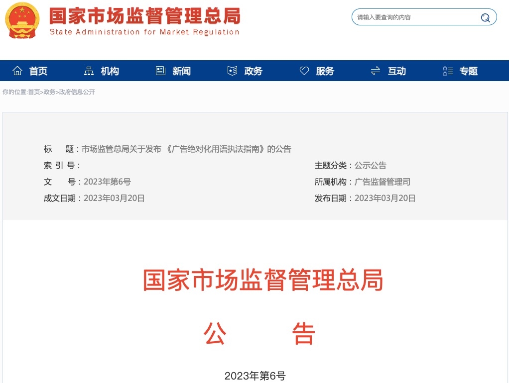 為進(jìn)一步規(guī)范廣告絕對(duì)化用語執(zhí)法,保護(hù)自然人、法人和其他組織的合法權(quán)益,維護(hù)廣告市場秩序,市場監(jiān)管總局于近日發(fā)布《廣告絕對(duì)化用語執(zhí)法指南》(以下簡稱《指南》),為市場監(jiān)管部門開展廣告絕對(duì)化用語監(jiān)管執(zhí)法提供指引。