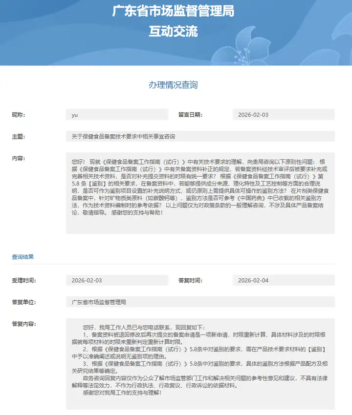 您好! 現(xiàn)就《保健食品備案工作指南(試行)》中有關(guān)技術(shù)要求的理解,向貴局咨詢以下原則性問題: 根據(jù)《保健食品備案工作指南(試行)》中有關(guān)備案資料補正的規(guī)定,若備案資料經(jīng)技術(shù)審評后被要求補充或完善相關(guān)技術(shù)資料,是否對補充提交資料的時限有統(tǒng)一要求?