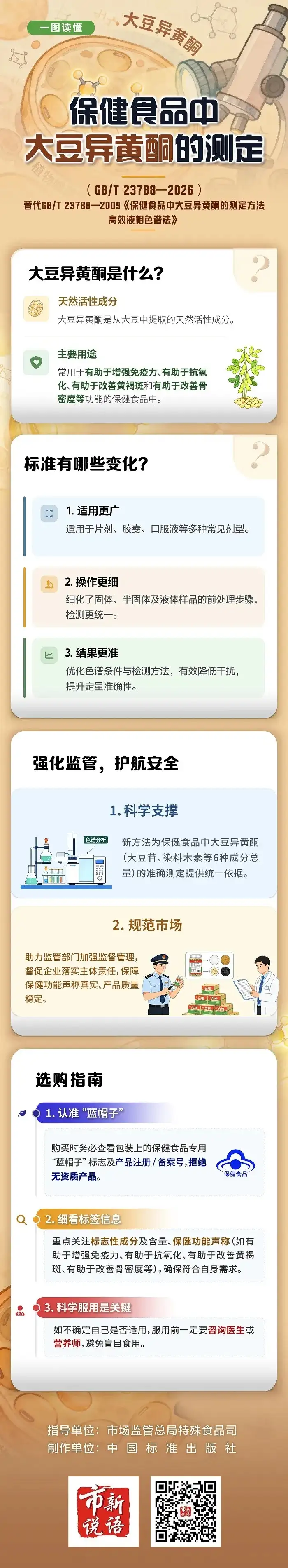 近日,全國特殊食品標準化技術(shù)委員會組織修訂的《保健食品中大豆異黃酮的測定》(GB/T23788—2026)推薦性國家標準正式發(fā)布,將自2026年8月1日起實施。