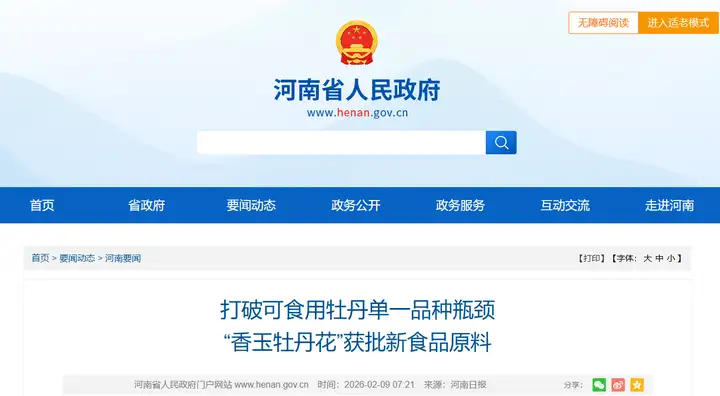 2月5日,國家衛(wèi)生健康委員會發(fā)布2026年第1號公告,讓一朵“河南花”綻放在國家新食品原料名錄中——由省科學(xué)院所屬的河南省商業(yè)科學(xué)研究所有限責(zé)任公司牽頭申報的“香玉牡丹花”,正式成為可食用牡丹家族的新成員,打破了可食用牡丹單一品種瓶頸。
