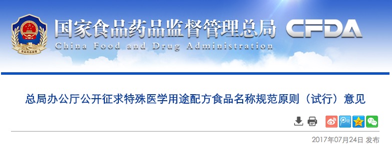 為做好特殊醫(yī)學配方食品的注冊工作,規(guī)范特殊醫(yī)學用途配方食品產(chǎn)品名稱,國家食品藥品監(jiān)督管理總局組織起草了《特殊醫(yī)學用途配方食品名稱規(guī)范原則(試行)》(見附件),現(xiàn)公開征求意見。