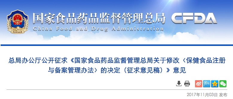 現(xiàn)向社會公開征求意見。請于2017年11月20日前將有關(guān)意見以電子郵件形式反饋至國家食品藥品監(jiān)督管理總局特殊食品注冊管理司。