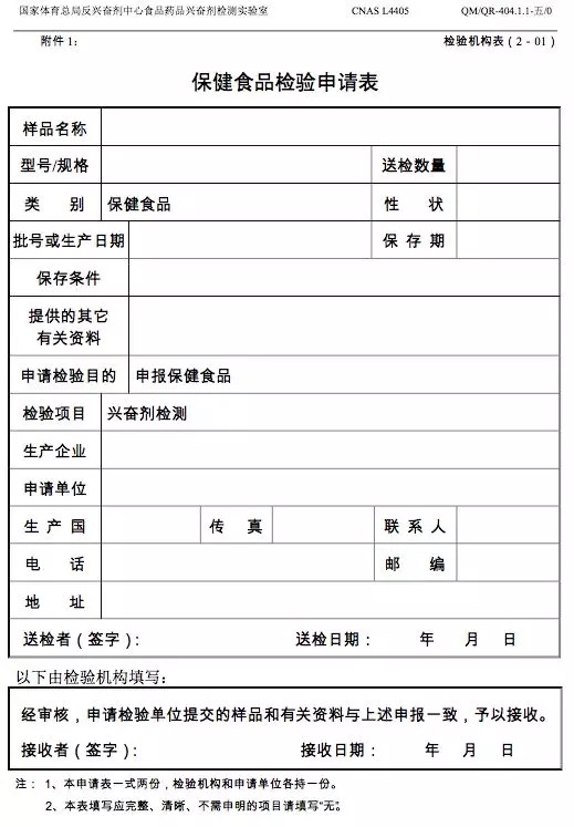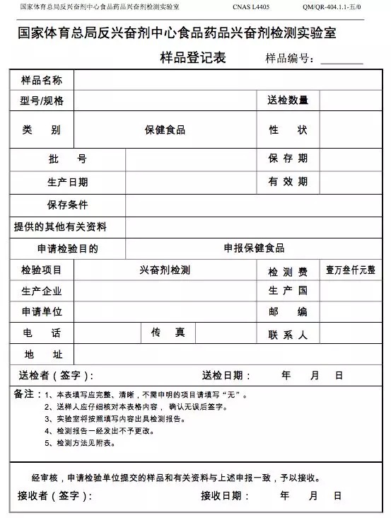 (二)《保健食品檢驗(yàn)申請(qǐng)表》(見(jiàn)附件二)和《國(guó)家體育總局反興奮劑中心食品藥品興奮劑檢測(cè)實(shí)驗(yàn)室樣品登記表》(見(jiàn)附件三)的填寫(xiě)