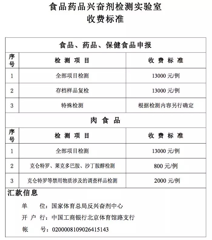 請(qǐng)按照《食品藥品興奮劑檢測(cè)實(shí)驗(yàn)室收費(fèi)標(biāo)準(zhǔn)》(見(jiàn)附件四)匯款,以單位名義匯款應(yīng)提供納稅人識(shí)別碼;若以個(gè)人名義匯款,應(yīng)在附言中注明發(fā)票抬頭及納稅人識(shí)別碼。