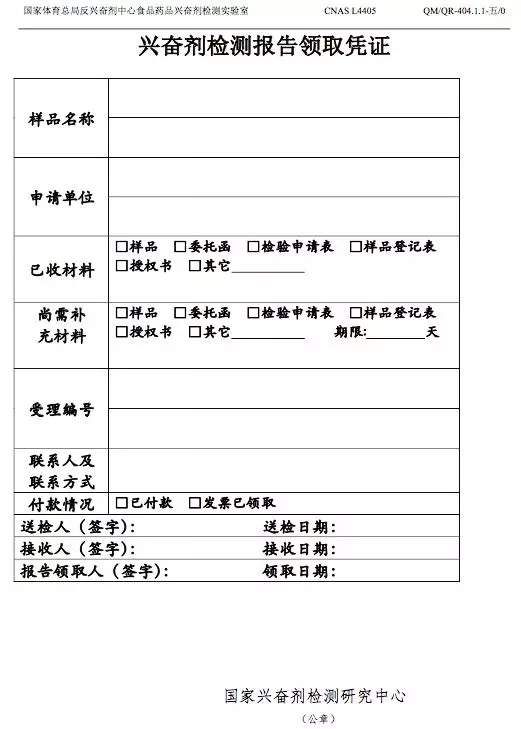 檢測(cè)費(fèi)到賬后,樣品完成受理,進(jìn)行興奮劑檢測(cè)。樣品檢測(cè)完畢后將盡快電話通知,領(lǐng)取檢測(cè)報(bào)告時(shí),請(qǐng)攜帶《興奮劑檢測(cè)報(bào)告領(lǐng)取憑證》(見(jiàn)附件五)。