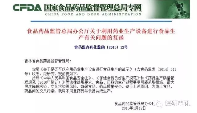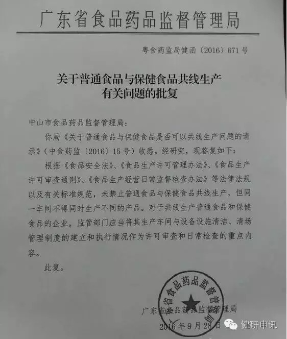 2016年9月,廣東省食藥監(jiān)局批復(fù)中山市食藥監(jiān)局“關(guān)于普通食品與保健食品共線生產(chǎn)的有關(guān)問題”一函被公開。此函中明確指出“未禁止普通食品與保健食品共線生產(chǎn),但同一車間不得同時生產(chǎn)不同的產(chǎn)品”。
