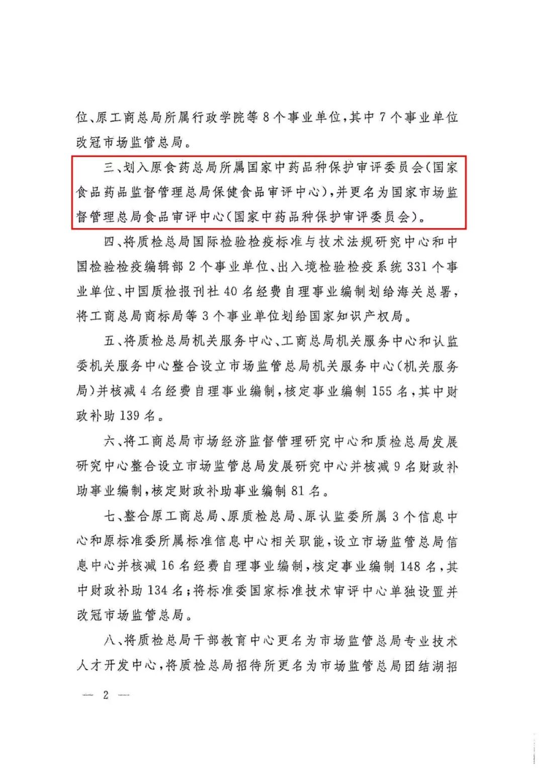 劃入原食藥總局所屬國家中藥品種保護(hù)審評委員會(國家食品藥品監(jiān)督管理總局保健食品審評中心),并更名為國家市場監(jiān)督管理總局食品審評中心(國家中藥品種保護(hù)審評委員會)。