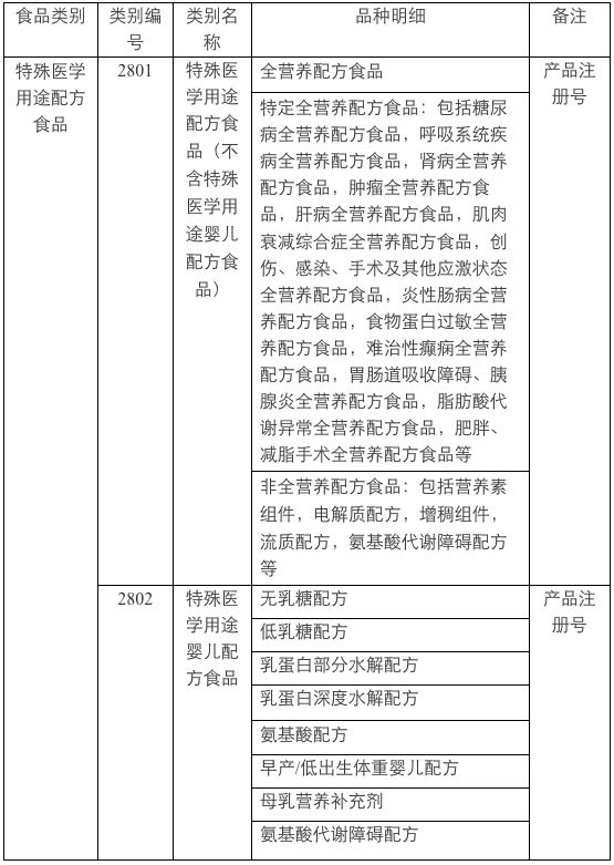 第二條 特殊醫(yī)學(xué)用途配方食品申證類別名稱分為:特殊醫(yī)學(xué)用途配方食品(不含特殊醫(yī)學(xué)用途嬰兒配方食品),類別編號2801;特殊醫(yī)學(xué)用途嬰兒配方食品,類別編號2802。特殊醫(yī)學(xué)用途配方食品生產(chǎn)許可食品類別、類別名稱、品種明細(xì)等見表1。