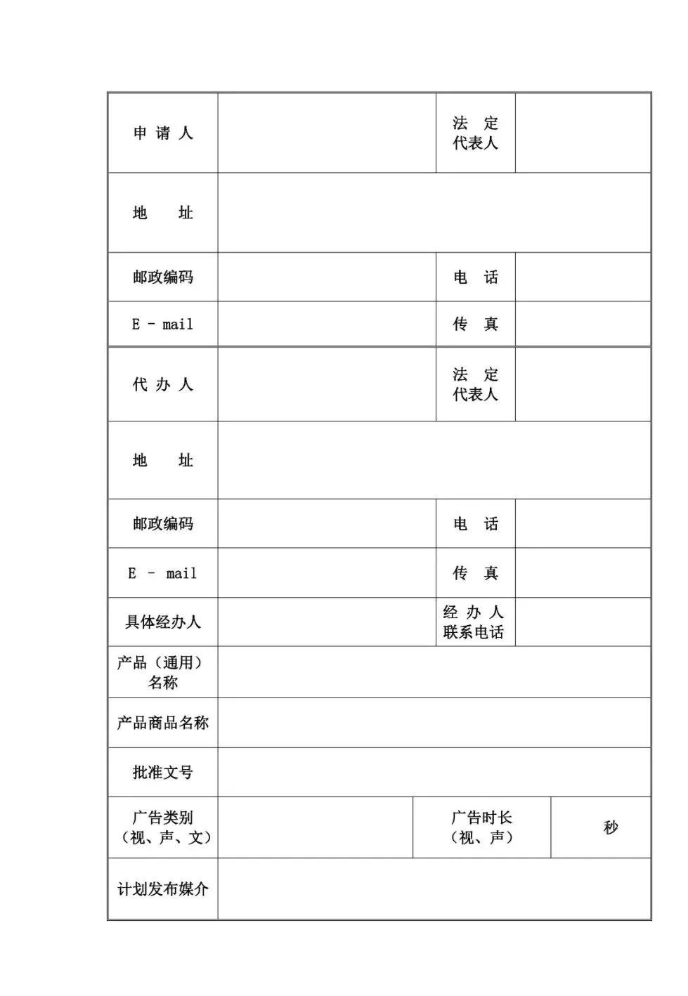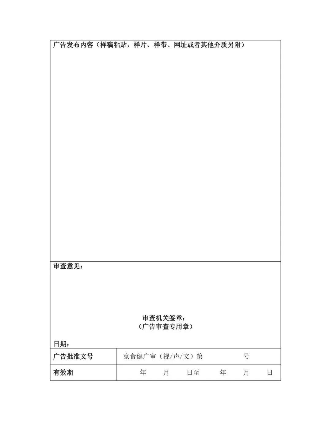 1、《廣告審查表》一式四份。如申請發(fā)布電視廣告、聲音廣告,需另附音、視頻光盤及文字腳本。