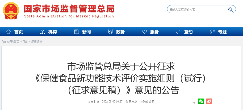 市場(chǎng)監(jiān)管總局根據(jù)《保健食品原料目錄和保健功能目錄管理辦法》,組織制定了《保健食品新功能技術(shù)評(píng)價(jià)實(shí)施細(xì)則(試行)(征求意見稿)》,現(xiàn)面向社會(huì)公開征求意見,意見建議反饋截止時(shí)間為2022年9月1日。公眾可以通過以下途徑和方式提出意見建議: