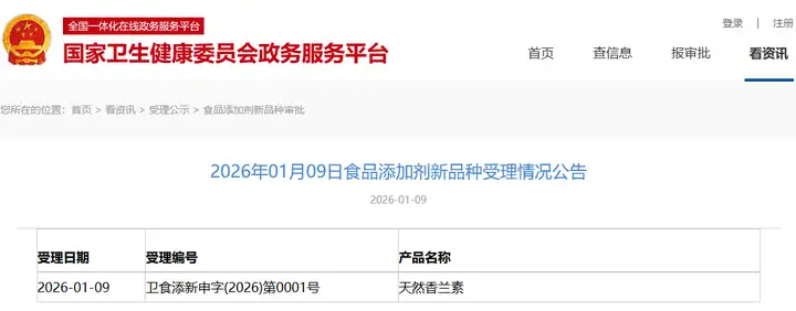 國(guó)家衛(wèi)生健康委員會(huì)政務(wù)服務(wù)平臺(tái)近期發(fā)布受理公告,其中食品添加劑新品種-新增受理:天然香蘭素。