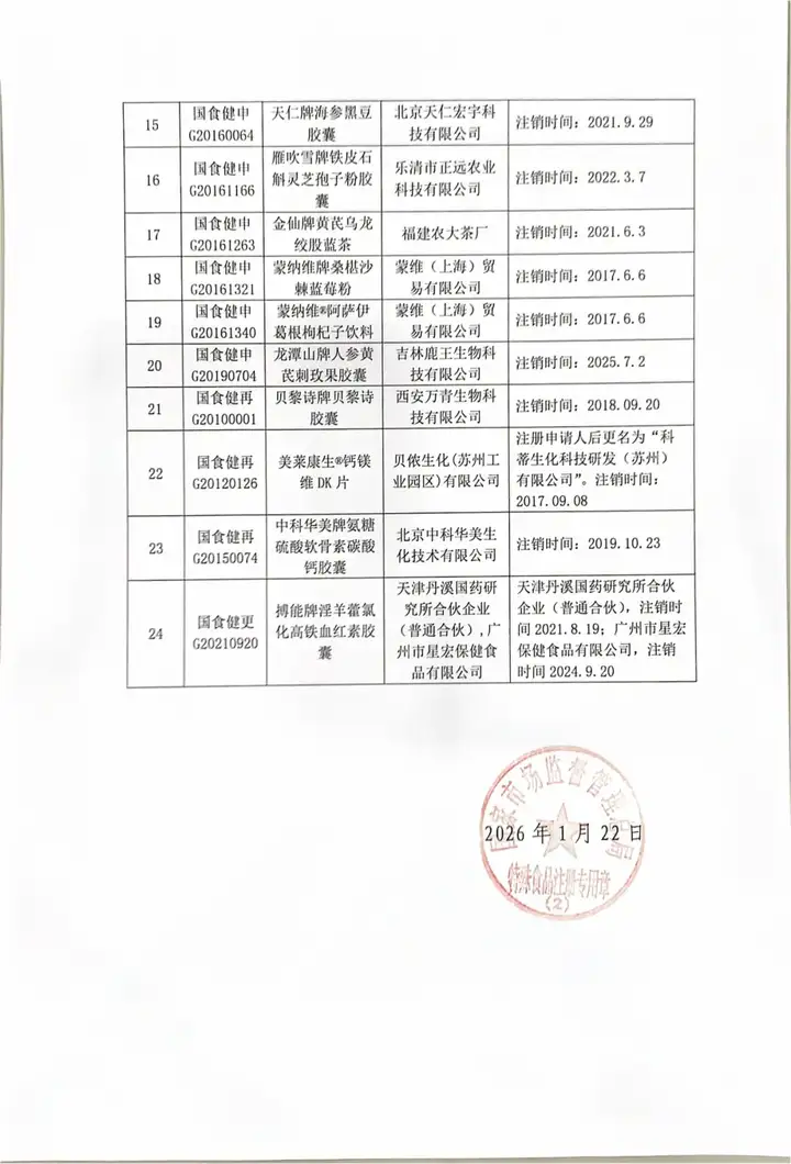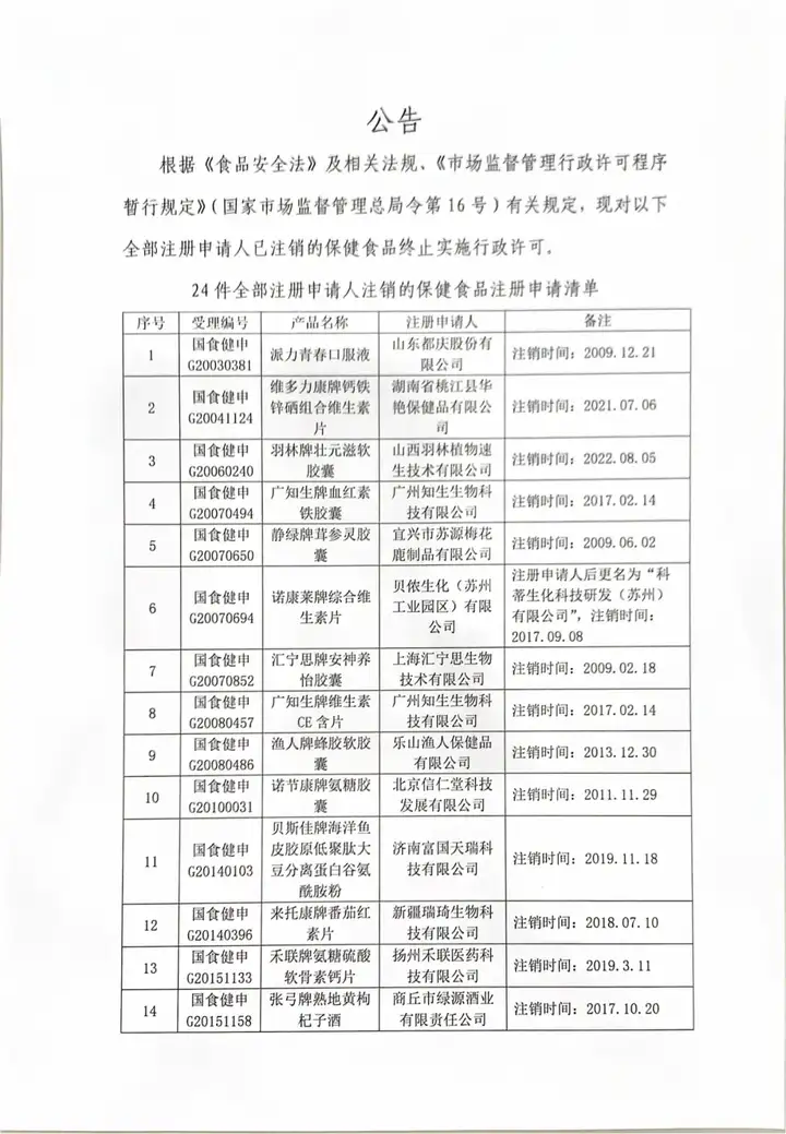 食審中心 | 關(guān)于對注冊申請人注銷的24件保健食品終止行政許可公告