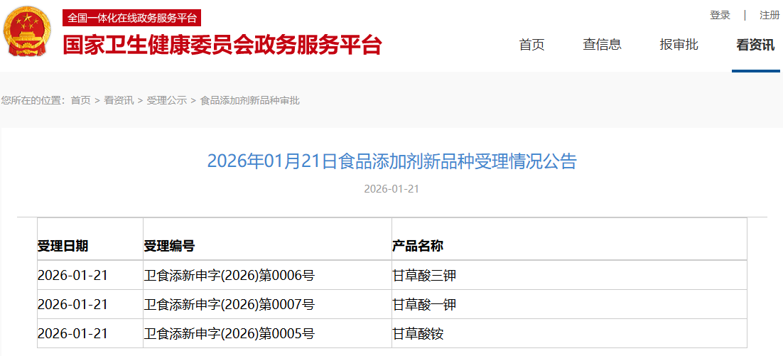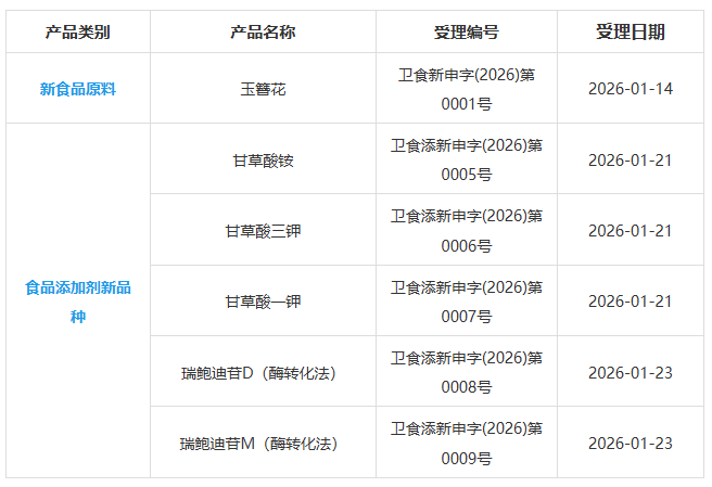 國家衛(wèi)生健康委員會政務(wù)服務(wù)平臺近期發(fā)布受理公告,其中新食品原料-新增受理1種:玉簪花;食品添加劑新品種-新增受理5種:甘草酸三鉀、甘草酸一鉀、甘草酸銨、瑞鮑迪苷D(酶轉(zhuǎn)化法)、瑞鮑迪苷M(酶轉(zhuǎn)化法)。