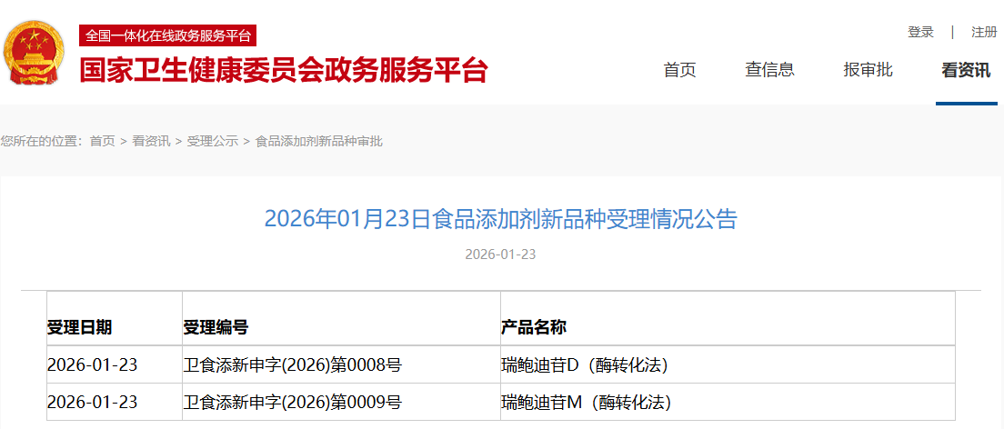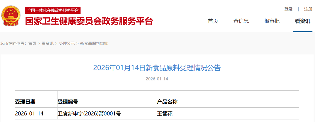 新增受理1種新食品原料