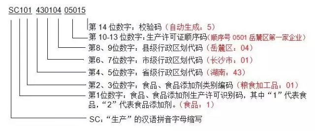 一、食品生產(chǎn)許可證編號由SC(“生產(chǎn)”的漢語拼音字母縮寫)和14位阿拉伯?dāng)?shù)字組成。數(shù)字從左至右依次為:3位食品類別編碼、2位省(自治區(qū)、直轄市)代碼、2位市(地)代碼、2位縣(區(qū))代碼、4位順序碼、1位校驗碼。