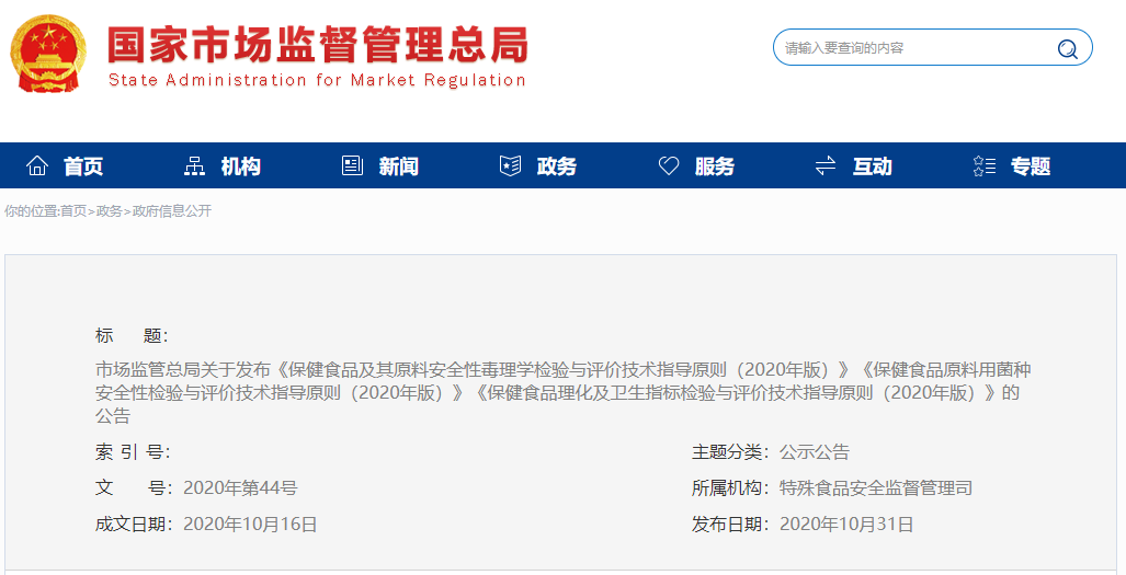 根據(jù)《中華人民共和國食品安全法》,經(jīng)與國家衛(wèi)生健康委協(xié)商一致,市場監(jiān)管總局制定了《保健食品及其原料安全性毒理學檢驗與評價技術(shù)指導(dǎo)原則(2020年版)》《保健食品原料用菌種安全性檢驗與評價技術(shù)指導(dǎo)原則(2020年版)》《保健食品理化及衛(wèi)生指標檢驗與評價技術(shù)指導(dǎo)原則(2020年版)》,現(xiàn)予印發(fā),自公告之日起施行。