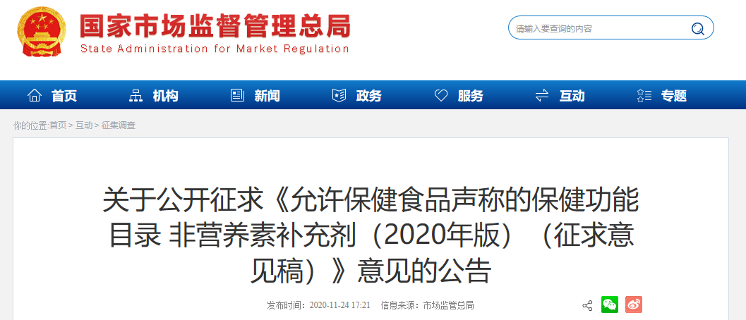 公眾還可以登錄國家市場監(jiān)督管理總局網(wǎng)站(http://www.samr.gov.cn),通過首頁互動(dòng)欄目中的“征集調(diào)查”提出意見建議,或者將意見建議郵寄至:市場監(jiān)管總局特殊食品司,北京市西城區(qū)北露園1號(hào),并在信封上注明“《允許保健食品聲稱的保健功能目錄 非營養(yǎng)素補(bǔ)充劑(2020年版)(征求意見稿)》公開征求意見”字樣。