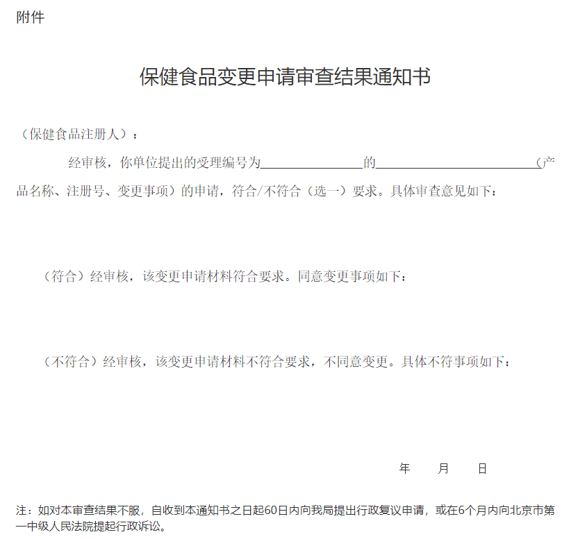 二、變更前持有的保健食品注冊證書是依據(jù)《保健食品注冊與備案管理辦法》生效前規(guī)章批準(zhǔn)的,發(fā)放《保健食品變更申請審查結(jié)果通知書》(見附件),與原批準(zhǔn)注冊證書合并使用。