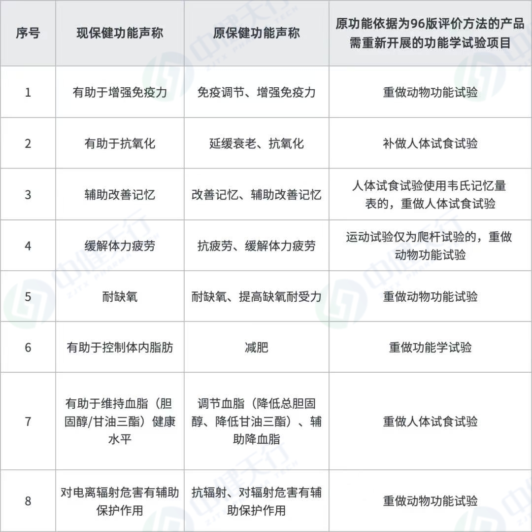 需重做或補做試驗的八項保健功能目錄