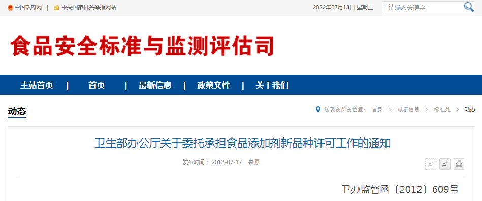 為做好食品添加劑新品種安全性審查和許可工作,根據(jù)《食品安全法》及其實(shí)施條例、中央編辦《關(guān)于印發(fā)〈國家食品安全風(fēng)險(xiǎn)評估中心組建方案〉的通知》(中央編辦發(fā)〔2011〕21號)規(guī)定,現(xiàn)決定委托你們承擔(dān)食品添加劑新品種許可的技術(shù)審查等工作。具體事宜通知如下: