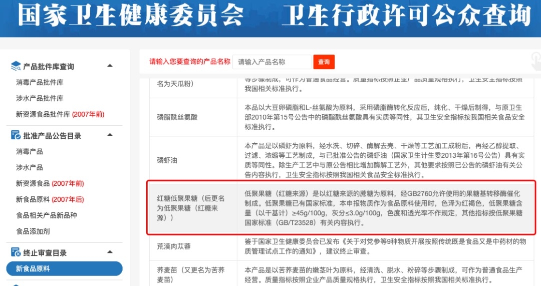 | 紅糖低聚果糖(后更名為低聚果糖(紅糖來源)) | 低聚果糖(紅糖來源)是以紅糖來源的蔗糖為原料,經(jīng)GB2760允許使用的果糖基轉(zhuǎn)移酶催化制成。低聚果糖已有國家標準,本申報物質(zhì)作為食品原料使用時,色澤為紅褐色,低聚果糖含量(以干基計)≥45g/100g,灰分≤3.0g/100g,色度和透光率不作規(guī)定,其他指標按低聚果糖國家標準(GB/T23528)有關(guān)內(nèi)容執(zhí)行。 |
