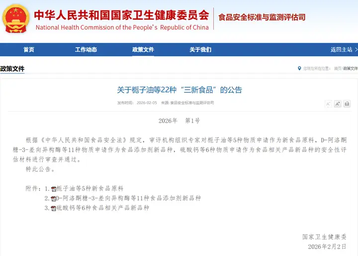 解讀《關(guān)于梔子油等22種“三新食品”的公告》(2026年第1號)